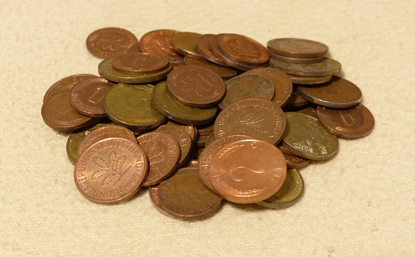 1-, 2-, 5- und 10Pfennig-Münzen in Wert von 1,47 DM.