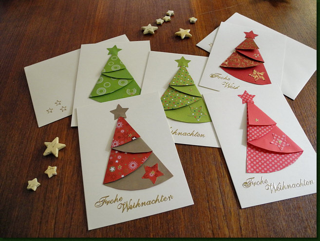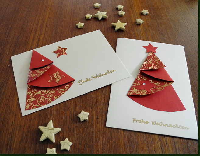 Heute sind es Halbkreise, die gefaltet und dann auf neutrale Klappkarten geklebt werden. Einen oder mehrere Sterne dazu ... fertig. weiter