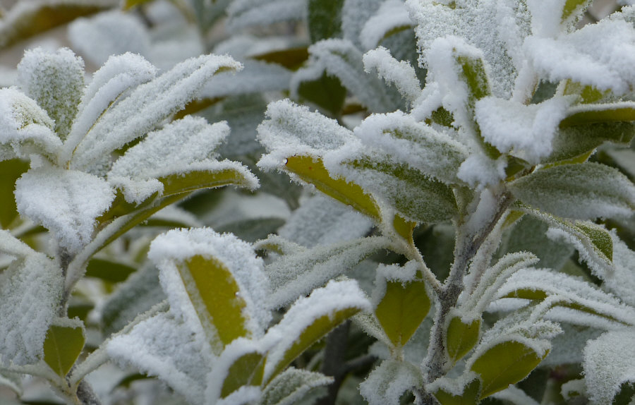 Mit dicker weißer Eiskruste ziert sich auch die Lorbeerhecke: