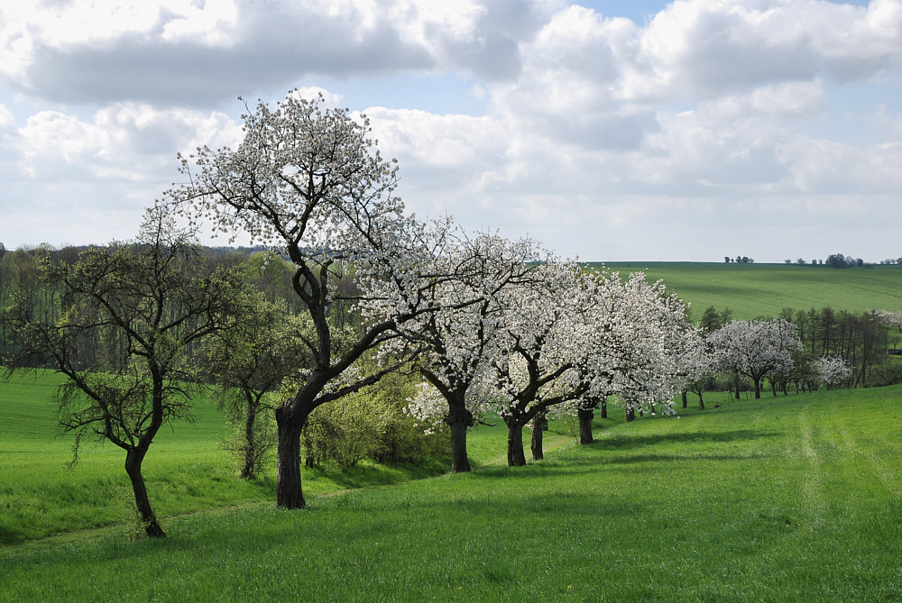 Wir sind heute in der Nähe Kohren-Salis, einem Ort zwischen Leipzig und Chemnitz. Eine wunderschöne ländliche Gegend ... durch die wir heute radeln. Ganz vorne radelt der Ingolf, er hat eine Kamera dabei. Er meint "wenn ich so etwas sehe, dann geht mir das Herz auf" ... ... mir auch ... Euch bestimmt auch bei diesen Bildern mit Frühlingsgrün, Streuobstwiesen und blühenden Kirsch- und Birnbäumen: ![]() ![]() ![]() |