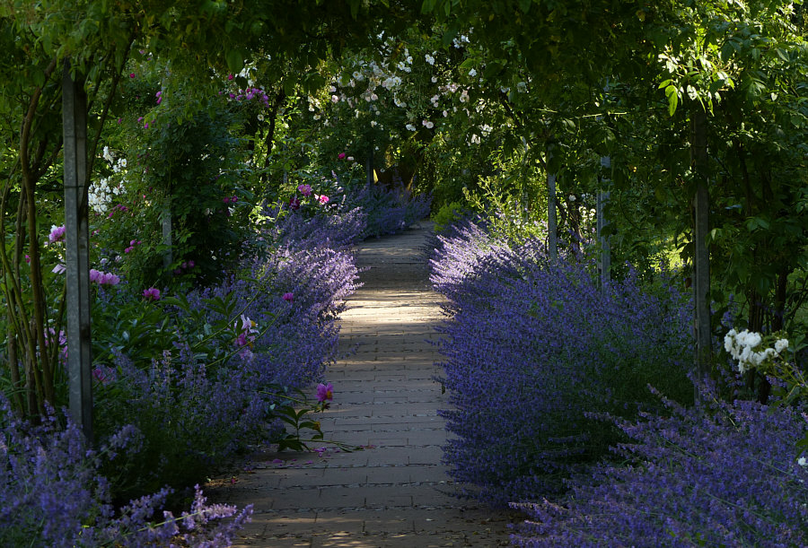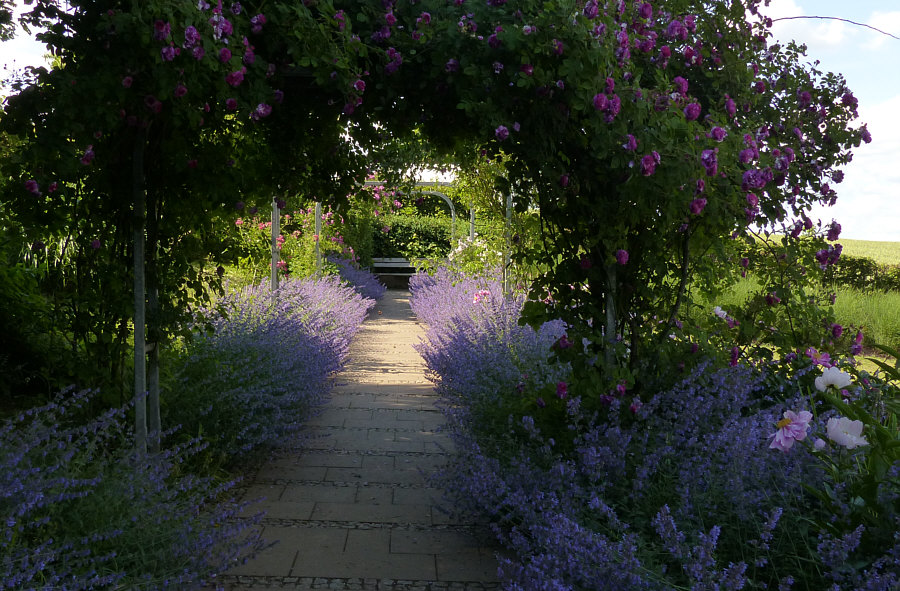 Ein Weg, unter Rosen hindurch, mit Katzenminze und Pfingstrosen an der