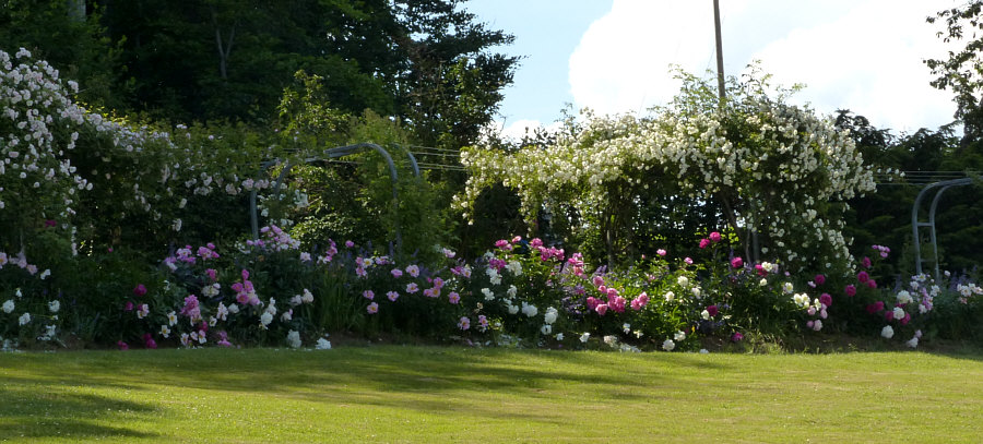 An den Bögen ranken Rosen, aber was seitlich des Weges wächst, sind
