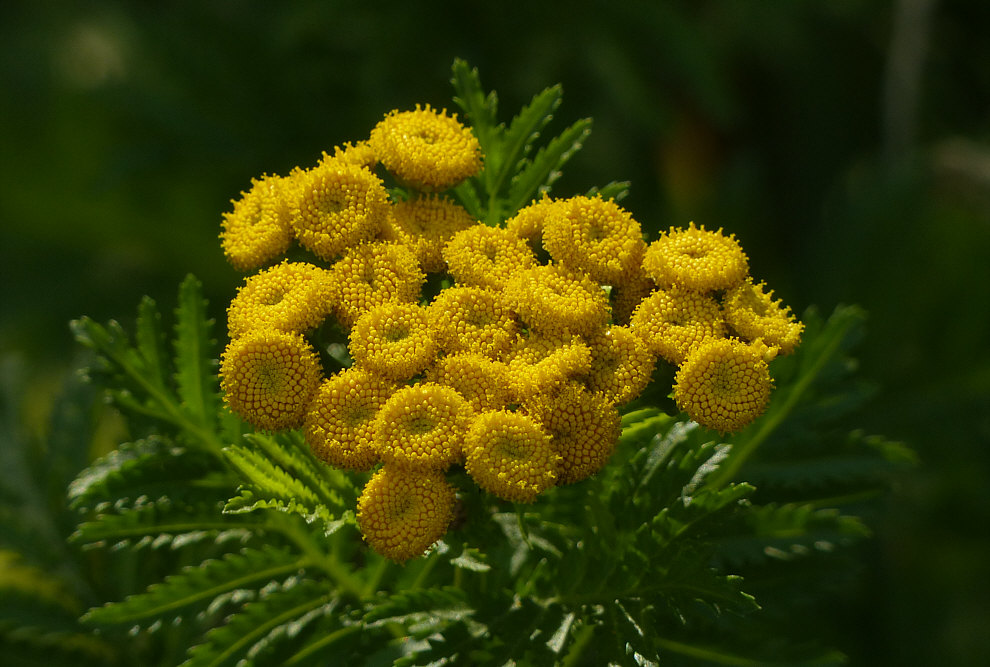 Das ist ... ![]() ... natürlich eine Margerite ... und es ist, worauf ich hinaus will, ein Korbblütler. Das gelbe in der Mitte ist der Korb, das weiße außen sind die Zungenblüten. Gibt es bei Gänseblümchen, Margeriten, Astern und vielen anderen Blumen. Es gibt aber auch eine Blume, bei der fehlen diese Zungenblüten, die tragen nur den Korb als Blüte ... diese Blume ist sehr häufig und wer ab und zu spazieren geht und das nicht nur durch bewohnte Straßen, hat diese Blume schon oft gesehen: ![]() Das ist eine Einzelpflanze, normalerweise sind die Blumen geselliger Natur und wachsen munter am Wegesrand. Ich darf heute vorstellen: den Rainfarn ![]() Der Rainfarn riecht sehr stark, weil er mit Campher, Borneol und Thujon ätherische Öle und auch Bitterstoffe enthält ... manche Menschen mögen den Geruch, andere überhaupt nicht. Aber hier im Internet riecht er ja nicht, darum kannst Du problemlos weiterlesen ;). Er blüht von Juni bis September mit leuchtend gelben körbchenförmigen Blütenständen. Weil die Röhren der kleinen Blüten nur 1 mm lang sind, ist der Nektar allen Besuchern leicht zugänglich. Der Rainfarn wird also sehr gerne und reichlich von Insekten besucht. Er blüht in Europa und Asien ... und ist mittlerweile in viele Gebiete eingedrungen, in denen er eigentlich nicht heimisch ist. Da die stark duftenden Blätter und Blüten insektenabweisende Wirkstoffe haben (wie das jetzt zum häufigen Insektenbesuch passt, weiß ich auch nicht), wurden sie früher ausgestreut, um Ungeziefer fernzuhalten. Im frühen Nordamerika wurde Rainfarn in Särge gelegt und Leichentücher wurden mit Rainfarnextrakt getränkt. Rainfarn wurde auch angepflanzt, um den Kartoffelkäfer zu vertreiben ... es gibt eine Studie, die besagt, dass dadurch die Kartoffelkäferbefall um ca. 80 % zurückgegangen ist. In der Imkerei wird getrockneter Rainfarn als Rauchmittel verwendet. Nein, nicht als Rauschmittel ;)). Rainfarn hat und hatte auch verschiedene medizinische Anwendungsmöglichkeiten, die alle aufzuzählen, würde nun den Rahmen sprengen ... und man kann aus Rainfarn zusammen mit Alaun ein dunkelgelbes Färbemittel herstellen. Vorsichtig, wenn man Rainfarn pflücken will, manche Menschen reagieren mit Allergien auf ihn. Nicht so verschiedene Raupen, die gerne diese Blume verspeisen. Was die Namen betrifft, so sind Rainfarn und Wurmkraut häufige Namen. Oder Gülden Knöpfle oder Westenknöpfe wegen der Blütenform. Ein paar weitere Namen von vielen: Jesuswurz, Kraftkraut, Michelkraut, Milchkraut, Muttergottesrute, Pompelblumen, Presskraut, Räuber, Rainfeldblümlein, Reifen, Revierblumen, Revierkraut, Tannkraut, Weinwermuth, Weisswurz. So ... und nun habe ich noch ein Bild, das die Schönheit dieser Blume zeigt: ![]() |