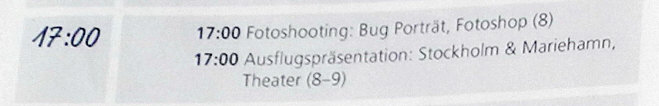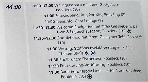 ![]() Immer noch Tag 1 - immer noch das "Aida heute"-Faltblatt: Elfi macht das ja richtig clever ... immer das Mittagessen ausfallen lassen. Ist gut für die Linie, man steht nicht im Stau und man hat mehr Zeit für die vielfältigen Programmpunkte, die so geboten werden. Ehrlich ... ich hätte das ja nicht gedacht ... dass es so viele Möglichkeiten gibt. Ich dachte, dass im Prinzip alles zur freien Verfügung ist und man entscheidet sich halt, ob man liegt, planscht, sauniert oder Shopping macht. Oder sich aufs Bett liegt und davon träumt, wie ein Fisch neben dem Schiff entlang zu schwimmen. Und abends dann möglicherweise in eine Show ... ja, ich dachte, dass man da am Vorabend eines Seetages sagt "was machen wir denn morgen so ?". Aber die richtige Frage ist "was von den vielen Möglichkeiten suchen wir denn aus" ... denn es gibt da ganz ganz viele Dinge, die ich Euch nun vorstelle und zwar chronologisch geordnet: ![]() Der Krabbeltreff wäre zwar originell, aber da gibt es eine Alterskontrolle ;)). Gut, dass es barrierefrei gibt, aber ich glaube, der Schiffsrundgang wäre eine gute Idee. ![]() Ooh ... entdecke die Möglichkeiten ... heidernei, was machen wir denn da ? Wie wärs mit Tanzkurs ... ist ja auch Sport ... oder wir stimmen uns schon mal auf die Höhepunkte der Reise ein ... und nun wissen wir auch, dass unser erstes Ziel Visby ist. ![]() Hey, Wikingerschach gibts ... und Stoffwechselaktivierung im Schlaf. Poolbrunch ... hey, sollen wir doch was essen gehen ? *gg* Pfeilewerfen gibts auch ... ![]() ... und eine weitere Einstimmung auf Schweden. Leider kostet die hausgemachte Limonade extra. Dafür können wir aber wieder tanzen ... cha cha - seit - ran. ![]() Was die Ostsee-Festspiele sind, ist unbekannt ... aber Loriot kennt jeder. Ein kleiner Hinweis steht auch noch dabei: "tagsüber musikfrei, außer am Heck und im FKK-Bereich (dort zieht man sich die Töne an ;)) )". ![]() Sportlich gehts weiter mit Shuffle-Board ... oder Rommé für alle, die sicht nicht so gerne ganzkörperlich bewegen. ![]() ![]() Also ... für Sportbegeisterte wird ja viel Abwechslung geboten. ![]() Beim Bingo soll die Moderation angeblich nervig schrill sein ... aber vielleicht ist sie auch aufmunternd lustig ... vielleicht erfahren wir es nie, weil wir nicht hin gehen ;)). Ein recht böser Kommentar irgendwo sagte: "Alles war darauf angelegt, zusätzlich maximalen Gewinn einzufahren" ... tja, Geld regiert die Welt und auch die Aida-Flotte ... natürlich möchte man, dass man in Urlaubslaune sich Dinge leistet, die man sich sonst nicht leisten würde. Aber man ist ja nicht verpflichtet dazu. ![]() ![]() Hier isse ja, die Show ... und tanzen ist auch angesagt. ![]() Und zum Abschluss des Tages lachen die Frauen am lautesten ;)). Aber besser, sie lächeln vorher schon, denn: ![]() Der Gewinner kriegt die Portraits geschenkt ... alle anderen können sie kaufen. Und die meisten ? Wollen sich nicht fotografieren lassen ;)). Tja, leider gibt es auch heute keine Bilder von Elfi ... aber wir dürfen uns schon vorfreuen ... ![]() ... ganz bestimmt hat Elfi das eine oder andere, was da beschrieben ist, fotografiert. Haben wir nicht gestern gesagt, dass das eine einzige Esserei gibt ... ... und das wissen auch die Herren und Frauen der Aida ... denn es gibt ... ![]() ... Tipps fürs Abnehmen ... und zwar zur Mittagszeit ... clever. Der Vortrag über Schweden ... ![]() ... klingt sehr interessant ... und für die, die sich etwas gönnen können (und wollen) ... ![]() ... steht Mode und Kunst auf dem Programm. Vieleviele Möglichkeiten, den Seetag zu verbringen ... ... und ich frage Dich nun: an welchen der vielen Programmpunkten würdest Du teilnehmen ? Wie wäre Dein Seetag auf der Aida. Guck nochmal über alles drüber und entscheide dann. [ wird fortgesetzt ] |