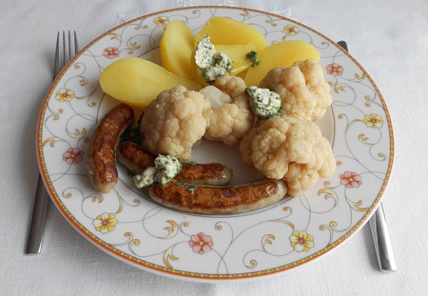 Nürnberger Würstl, Kartoffeln, Blumenkohl, selbst gemachte Kräuterbutter