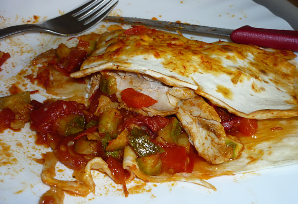 Gemüsemischung mit Hähnchenfleisch, in einem türkischen Lavash