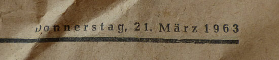Dieses Bild ... ![]() ... hatte ich vorgestern schon im Tagebuch gezeigt ... das ganze Gerümpel trugen die Handwerker vom Dachboden nach ganz unten ... ... und gestern haben wir das dann ins Auto gepackt und ab zur Deponie. Aber nicht ohne vorher mal ein bisschen zu gucken ... natürlich mit Kamera ;). Zuerst die alten Deckenplatten ... ![]() ... Plastik und dahinter Styropor ... die hellen hatte ich im Wohnzimmer, die dunklen meine Mutter. Ja, und mein alter Nadeldrucker ... den gibts natürlich nicht mehr, aber der Karton lag noch da rum ... ![]() ... das war ungefähr 1990 ... damals gab es noch Endlospapier, das an den Seiten Löcher hatte: ![]() Ein alter Malkasten und ein Kinderhandschuh kamen auch zum Vorschein ... ![]() ... und dieser alte Kinderkoffer: ![]() Hier ist er leer ... ![]() ... bis auf meinen von meiner Mama reingeschriebenen Namen abgesehen ... ![]() ... aber da war vorher was drin ... denn ordentlich, wie meine Mama war, hatte sie natürlich den Boden mit Zeitung ausgelegt ... und diese Zeitung ... ![]() ... lag noch drin :)). Und es ist auch noch die Zeitung vom Frühlingsanfang ... ![]() ... und nun weiß ich auch, wofür dieser Koffer gekauft wurde. Denn ich kam damals in Kinderkur, weil ich so nervös war. Hat nichts genutzt, aber das ist ein anderes Thema ;)). Hey ... werfen wir doch mal ein paar Blicke in diese Zeitung rein ... ![]() ... upps, das klingt jetzt aber ziemlich aktuell. Dass die Zeitung aber alt ist, merkt man daran, dass da ... ![]() ... noch Zigarettenanzeigen zu finden sind. Schauen wir weiter ... ![]() ... ja, die alten Zeiten ... diesen Knaben- und Männerchor gibts schon lange nicht mehr. Die CDU aber schon ... ![]() ... und damals schaltete sie noch Anzeigen, dass sie im Fernsehen zu sehen ist. Heute ist sie dort sowieso zu finden ;). Der Winter 1963 ... ![]() ... schien auch ganz schön kalt gewesen zu sein. Und es gab damals noch Pappelvereine ... ![]() ... wenn man heute "Pappelverein" eingibt, heißt es "meinten sie Paddelverein" *gg*. Schach gabs damals natürlich auch schon ... ![]() ... diese Rubrik hatte ich stets in der Zeitung ignoriert und auch solche Grafiken ... ![]() ... aber ich kann mir vorstellen, dass das für Schachfans stets ein Muss war und ist. Nicht heute, sondern morgen ... ![]() ... gibts Gustin in der Zeitung ... tja, in den 60er Jahren gabs noch nicht den Dr. Sommer, da war das noch Dr. Oetker ;)). Die Zeitung von morgen habe ich aber nicht, doch ich habe von diesen Seiten noch nicht alles Interessante gezeigt, an einem späteren Tag schauen wir mal in die Kleinanzeigen und in das TV-Programm. |