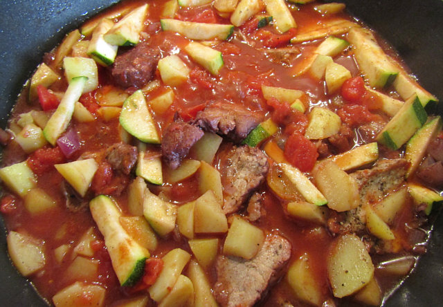Gestriger Reste-Filettopf mit Zucchini, klein geschnittenen Kartoffeln,