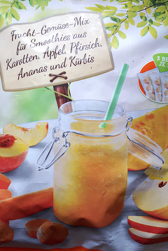 Heute gehts um Supermarkt, Obst, Gemüse und Smoothie. Ich hab da schon ne Meinung dazu ... aber ich sag sie noch nicht. Denn ich will Euch nicht beeinflussen. Aber vorab ... es gibt Menschen, die essen nur Obst aus lokaler Erzeugung und nur, was gerade Saison hat und bzw. noch lagerfähig ist ... für die ist das natürlich nix. Allerdings dürfen die dann auch keine Mandarinen oder Bananen essen. Ja, man kann darüber diskutieren ... man kann sich auch drüber streiten, ob denn ein "Smoothie" sinnvoll ist ... die, die schon fertig gemixt im Kühlregal stehen, sind es sicher nicht. Aber daheim selbst aus Obst einen Smoothie machen ... das ist gesund. Man muss es natürlich wollen und mögen. Entweder wird für einen solchen Smoothie gezielt Obst gekauft oder man nimmt das, was gerade da ist. Es gibt eine Alternative ... im Tiefkühlregal. Hier mal 4 Beispiele bzw. Geschmacksrichtungen: