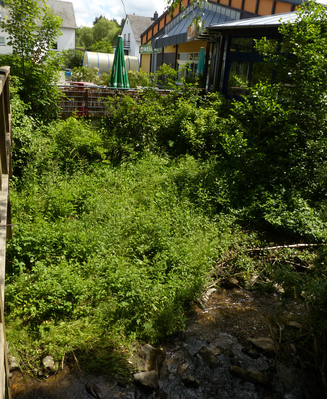 Tische und Sonnenschirme fast im Grünen, links die Brücke und unten der