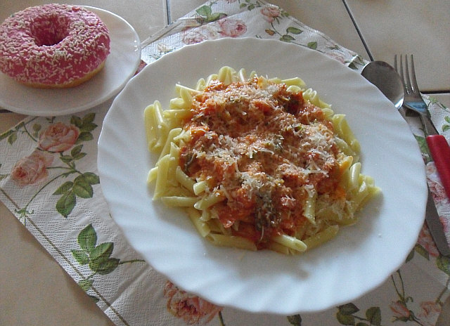 Ich habe mir ein schnelles Nudelgericht gemacht mit Tomatensoße,