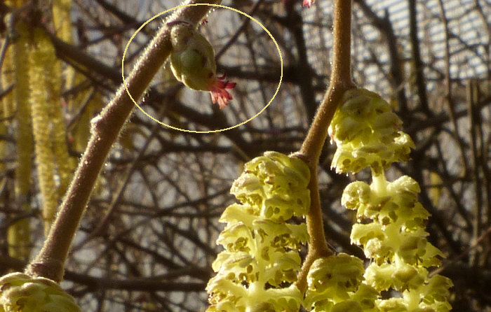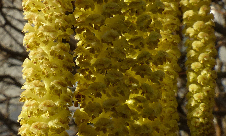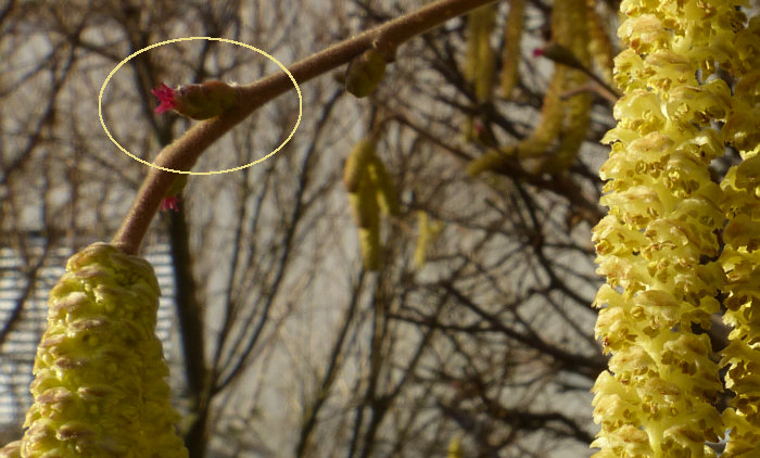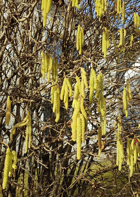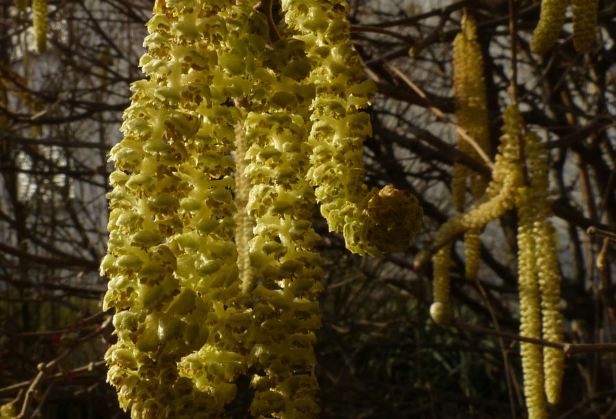 Die gemeine Hasel ... ![]() ... auch einfach nur Haselstrauch genannt. Blüht auch schon im Spätwinter. Auf den ersten Blick fallen die Kätzchen auf ... das sind die männlichen Blüten. Aber die Hasel ist ein Strauch, der über männliche "und" weibliche Blüten verfügt. Die weiblichen Blüten ... ![]() ... die sind viel kleiner und haben ... ![]() ... vorne so ein rotes Dingens. Die Hasel ist ein wichtiger Pollenlieferant für die Honigbienen. Allerdings werden an warmen sonnigen Wintertagen nicht die weiblichen Blüten, sondern nur die männlichen Kätzchen angeflogen. ![]() ![]() ![]() Ein einziges Kätzchen enthält 2 Millionen Pollenkörner und wenn man mit der Hand leicht dagegen schlägt, dann lösen sie sich in ganzen Staubwolken. Wenn man die Kätzchen zärtlich in die Hand nimmt ... sieht danach die Hand so aus: ![]() Fühlt sich gut an ... ist wie ganz ganz feines Puder. |