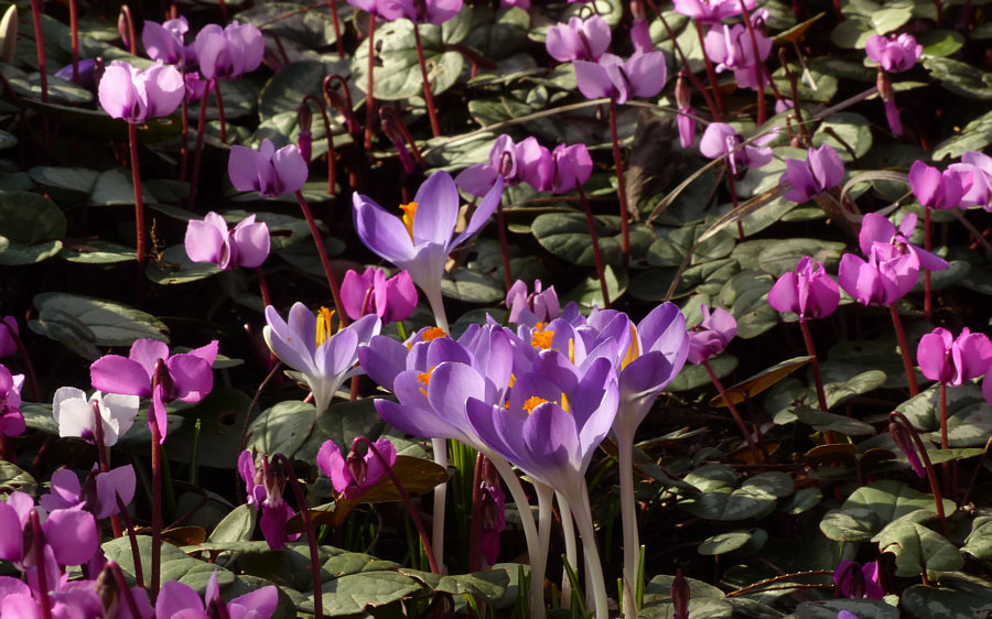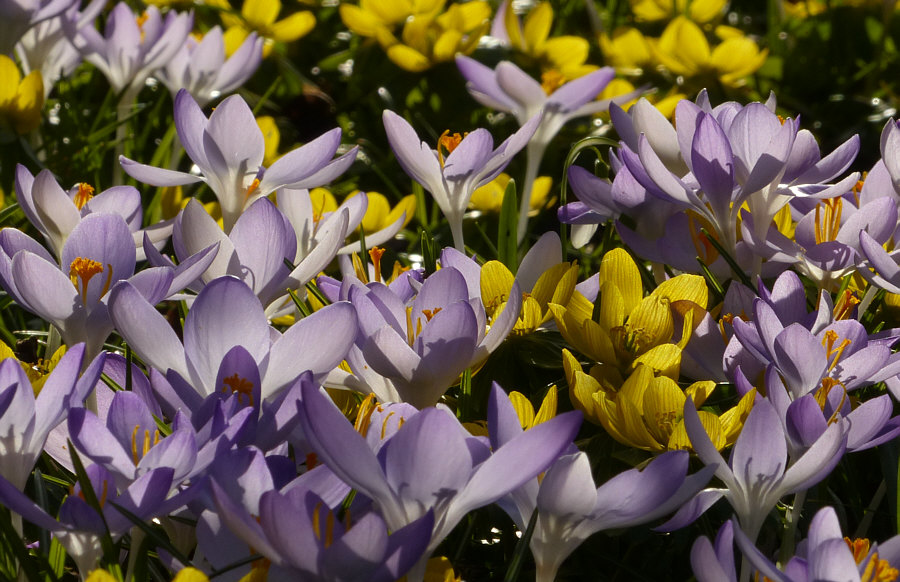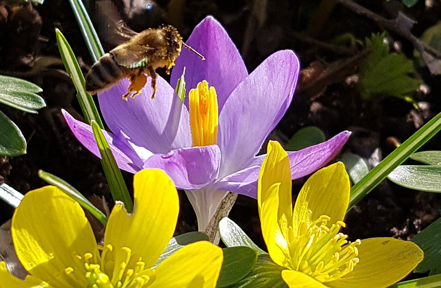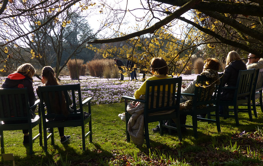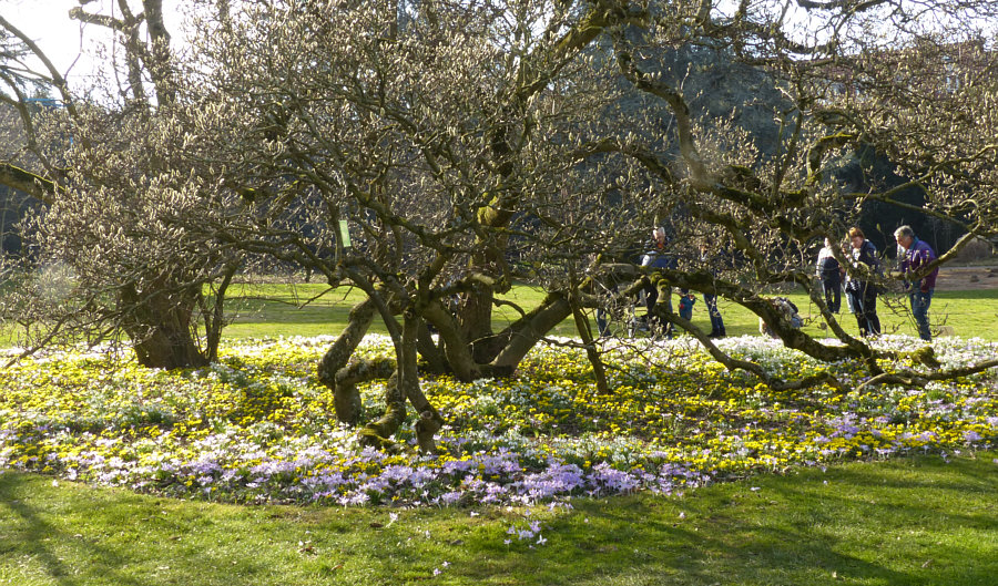Es ist nochmal Samstag ... und wir stehen nochmal vor diesem Schild: ![]() Und wir sehen, dass unter diesem Schild noch ein Schild hängt: ![]() Hmm ... wir haben aber heute Samstag, den 16. ... auch dieses Schild öffnet uns nicht das Tor. Aber es gibt Hoffnung. Theoretisch. Aber soll ich wirklich einen Tag später nochmal 100 Kilometer hin und 100 zurück fahren, um die Krokusse fürs Kalenderblatt zu fotografieren ?? Ich schaue über den Zaun ... ![]() ... all das, was da so hell leuchtet, sind Krokusse. Nein, das darf man sich nicht entgehen lassen ... also einen Tag später nochmal hin ... und hier sind die Bilder: ![]() Es war viel los ... viele Menschen haben Frühlingssehnsucht und auch das Schild gelesen. Und es war Sonntag und auch dieses traumhafte Wetter ... Sonne und 17 Grad. Da leuchten die Krokusse so wunderbar: ![]() ![]() ![]() Gehen wir doch rüber zu der alten Magnolie ... dort blühen Krokusse, Schneeglöckchen und Winterlinge untendrunter: ![]() ![]() ![]() Im ganzen Garten summt es ... viele viele Bienen habe ich gesehen: ![]() ![]() ![]() Sogar eine Holzbiene konnte ich fotografieren: ![]() Die ganzen Krokusse sind natürlich nicht die späten Krokusse, die viel größer sind, sondern die frühen Elfenkrokusse, die immer schon im Februar blühen. Wilde Krokusse konnte ich auch fotografieren ... ![]() ... und sogar einen Märzenbecher (Frühlings-Knotenblume): ![]() Auf dieses Motiv ... ![]() ... hat mich ein Vogel hingewiesen, denn er ist gerade in dem Moment vom Ast geflogen, als ich dort, den Blick auf Krokusse gerichtet, vorbeigelaufen bin. Ich wurde aufmerksam und sah, welches wunderschöne Motiv dieser Ilex doch ist. Ebenfalls rot sind die Beeren ... ![]() ... der immergrünen Strauchmispel. Hier sieht man sehr schön, dass all die Krokuswiesen von Bewässerungsschläuchen durchzogen sind, man muss dann eben so fotografieren, dass sie nicht zu sehen sind. Ich würde mal sagen, dass die Besucher des Hermannshofes an diesem Tag durchweg sehr glückliche Menschen waren ... und sie saßen auch gerne und lange da und schauten in die violette Pracht: ![]() Eines muss ich Euch noch zeigen ... ![]() ... das sind die tollen Alpenveilchen, die auch geblüht haben. ![]() In kräftigem Pink ... ![]() ... aber auch in weiß. Und manchmal mit Krokussen vermischt: ![]() Ein Traum ... und es hatte sich mehr als gelohnt, nochmal dorthin zu fahren :)). |
