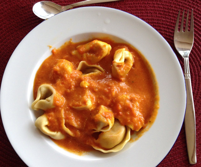 gekaufte Ravioli mit selbst gemachter Paprikasoße.