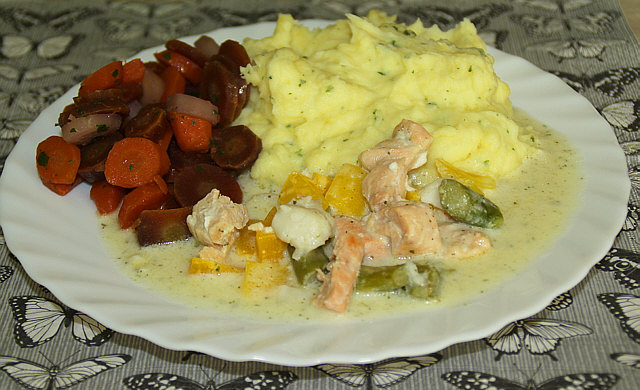 Diesmal Seelachs, Lachs und Krabben mit Zucchini, Fenchel, Paprika und