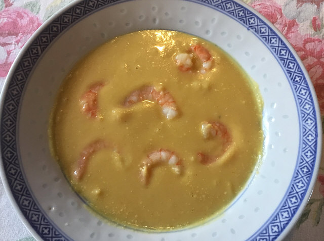 Rosenkohlcremesuppe mit Curry, Kreuzkümmel und Kokosmilch.