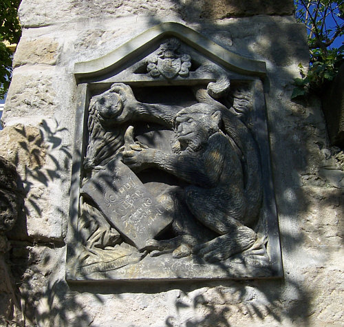 ![]() Ich zeige Euch auch noch die Orgel und den Blick vom Altar aus: ![]() Rund um die Kirche ist ein alter Kirchhof, ein Friedhof. An der Friedhofsmauer hängt dieses Kuriosum: ![]() Das ist der "Schnuff-Stein" ... steht auch drauf: ![]() Das ist ein Epitaph ... ein/e Grabdenkmal/-inschrift an einer Kirchenwand oder einem Pfeiler. Und dieser hier ... das kam so. Carl Maria von Weber, ein berühmter Komponist, war mit seiner Frau in Hamburg und kaufte einem Matrosen einen Kapuzineraffen ab. Er nannte ihn "Schnuff Weber" ... das Äffchen war an seiner Seite in den Hamburger Tagen und auch später in Dresden. Vor allem in Dresden sorgte Herr Weber mit seinem Affen für Aufsehen. Diesem zahmen Affen widmete nach dessen Tod der Bildhauer Joachim Zehme einen Epitaph, dessen Nachbildung heute versteckt in der Mauer der Hosterwitzer Kirche zu finden ist. Weitere Infos zur Sonntagskirche kann man hier nachlesen. |