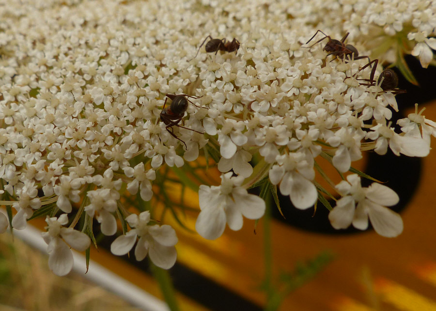 Kleiner Spaziergang zum Nachbarort gestern Nachmittag ... noch bei uns im Ort blühte eine wilde Möhre und darauf krabbelten, warum auch immer, einige Ameisen drauf rum: ![]() Wie schön ... mal Ameisen in angenehmer Fotografier-Höhe ... ![]() ... was mir die Gelegenheit gab, zu fotografieren ... ein Bild habe ich schon im Tagebuch gezeigt, hier nochmal in groß ... ![]() ... und hier ein zweites: ![]() Gleich daneben ein verwilderter Garten ... ![]() ... doch verwildert bedeutet nicht blütenlos, denn so konnten sich ... ![]() ... die Wicken ganz ungehindert ausbreiten. ![]() Wir laufen weiter und lassen den Ort hinter uns und folgen dem Weg an Wiesen und Feldern entlang ... und wir sehen Kornblumen und Kamille: ![]() Man kann so ein Feld ganz natürlich und gegenständlich fotografieren ... ![]() ... man kann aber auch versuchen, mal ein impressionistisches Foto zu machen: ![]() Ein Baum trägt Früchte ... ![]() ... aber verrät uns nicht, welche Früchte das sind: ![]() Die sehen ja lecker aus und bei einem anderen Baum sind sie auch schön rot ... ![]() ... aber wir kommen gar nicht in Versuchung, denn die Früchte hängen höher als die Arme greifen können. Das ist so die Aussicht vom Weg aus bei dem größten Teil unserer Strecke ... ![]() ... und an dieser Stelle gibt es viele ![]() ![]() An einer Stelle hat sich noch eine andere Blume dazwischen gemogelt: ![]() Auch eine Schönheit ... ganz einfach, ganz rund, ganz still ... die Winde: ![]() Überall liegen Heuballen ... ![]() ... und einen Bach gibt es hier auch. Wir kommen nochmal an ganz vielen Kornblumen vorbei ... ![]() ... und dann an einigen Getreidefeldern ... ![]() ... die, wie dieses Bild schon erahnen lässt, einer grünen Mono-Kultur Platz machen, denn nun sehen wir nur noch Maisfelder: ![]() Hier sind wir schon fast am Ziel ... aber vorher darf ich noch mal zeigen, welche Adleraugen Beate hat ... denn schaut doch mal ... ![]() Seht Ihr etwas Besonderes ? Beate schon ... denn sie sagt hier ganz spontan ... "da vorne ist doch ein Reh" ... ![]() ... und sie hat natürlich Recht: ![]() Das war ein ganz normaler Spaziergang mit Ameisen, Wicken, Beeren, Kornblumen, Spiersträuchern, Getreidefeldern, Heuballen, Impressionismus, Winden, Mais und einem Reh. |