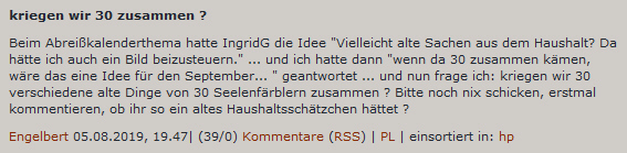 Thema Abreißkalender September ... im Tagebuch hatte IngridG diese Idee: ![]() Meine Antwort war diese: ![]() Danach hatte ich dann gefragt ... ![]() ... und ich darf feststellen: wir kriegen 30 zusammen, sogar mehr :). Also gibt es heute hier den Aufruf für den Abreißkalender September Bitte fotografiere Dein altes Haushaltsschätzchen und schicke mir das Bild. Bitte achte darauf, dass das Bild nicht unscharf ist und das Du es im Querformat fotografierst. Bitte ohne Blitz bei Tageslicht fotografieren. Bitte schicke mir das Bild bis zum 19. August (an anghy@t-online.de) zu. |