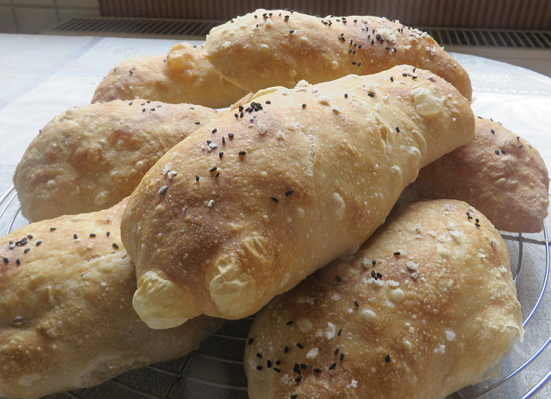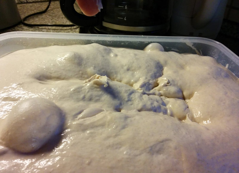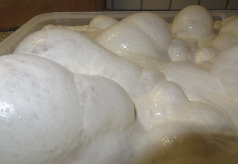 ![]() Upps ... was ist denn das ? Kleister ? Kaugummi ? Fensterabdichtungsmasse ? Nein ... das ist etwas leckeres ... theoretisch. In dem Zustand noch nicht lecker ... aber auf dem Weg dazu. Erstmal zum "was ist da alles drin ?": --> Vorteig <-- 200 g Weizenmehl (550er) ein paar Frischhefekrümel 120 ml kaltes Wasser mit der Gabel gleich im Glas durchschlagen, so dass alles klumpenfrei wird. Ab in den Kühlschrank über Nacht. --> Hauptteig <-- der Vorteig 460 Gramm Weizenmehl (1050er) etwas Dinkelvollkornmehl 14 gr. Salz 1 erbsgroßes Stück Frischhefe 410 ml kaltes Wasser (Zugabe 300 ml + 110 ml) 1 TL Malz (nichtaktives Pulvermalz) Alles wird außer den 110 ml Wasser mit dem Knethaken ca. 5 min. langsam geknetet und dann ca. 7 min. schnell geknetet. Dann kommen die restl. 110 ml Wasser hinzu und es wird ca. 2 min. langsam und ca. 3 min. schnell geknetet. An dieser Stelle war der Teig noch zu flüssig. Also noch eine Schippe Mehl (550er) dazu und wieder kneten ... bis der Teig noch weich ist, aber sich fenstern lassen sollte. Das hat diesmal ziemlich lange gedauert. Das lag am 1050er und am Dinkelvollkornmehl, welches offenbar nur langsam geknetet werden sollte. Ob ich, der Engelbert, das alles geknetet habe ? Oder kneten ließ ? Aber nein ... wir sind heute bei ReginaE in der Küche. Und ich glaube, der Teil mit Dehnen und Falten fehlt oben. Denn dieses Bild ... ![]() ... das ist am 2. Abend vor "dehnen-und-falten". ![]() Man kann dran ziehen ... ![]() ... und den Teig wieder fallen lassen. ![]() Am 2. Abend vor "dehnen-und-falten" ... Teig hoch gezogen. Hier sieht man sehr schön, wie der Teig "fenstert". Das bedeutet, die Zutaten sind homogen gemischt, u.a. auch durch eine Teigtemperatur, die beim Kneten entsteht und dafür sehr wichtig ist. ![]() am Morgen danach Blasenwurf in Nahaufnahme ![]() viele Blasen sind während der Nachtgare im Kühlschrank im geschlossenen Behälter entstanden. Also arbeitet der Teig auch bei +6 °C Kühlschranktemperatur. Am nächsten Tag raus aus dem Kühlschrank und Raumtemperatur annehmen lassen. Der Teig wird auf ein nasses Blech gekippt. Und mit nassen Händen Portionen von ca. 120 g abziehen und auf das Pergamentpapier legen. ![]() Ehe der Teig in den Backofen kommt, wird grobes Salz und Kümmel (bei Regina Schwarzkümmel) darüber gestreut. Der Backofen wird nun auf 240 Grad vorgeheizt. Nun das Pergamentpapier mit den Teiglingen auf den heißen Backstein im Ofen ziehen, gut dampfen und nach ca. 7 Min. runter auf 210 °C schalten. Die Backzeit = 20-25 min. Laut Rezept sollen die Teile nach dem rausnehmen sofort mit Wasser besprüht werden. Das hatte Regina aber vergessen. Bevor ich das Backergebnis zeige, will ich noch sagen, dass diese Teile uuunbedingt ins Kalenderblatt mussten und dass nichts so gut zu Seelenfarben passt wie diese Backwaren. Denn das sind ... "Seelen" ... eine schwäbische baguetteartige Brotspezialität. Und so sehen die Seelen fertig gebacken aus: ![]() Guten Appetit :)). |
