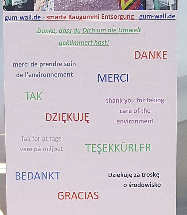 Ein bisschen ekelig heute ... aber auch menschlich. Und den Kiefer stärkend ;)). Erinnert Ihr Euch noch an die Schulzeit ... wenn man da mal gedankenverloren, an die Unterseite des Schultisches gefasst hat ... diese Knubbel ? Die verhärteten Kaugummi-Erinnerungen an alte Zeiten. Oder an den Moment, wenn man in einen frischen Kaugummi getreten ist und sich gewünscht hätte, er wäre schon hart gewesen. Ist ja an sich nix dagegen zu sagen ... Kaugummi gibt es zu kaufen, er regt den Speichelfluss an, beruhigt, trainiert. Über seinen Geschmack kann man streiten ... lange währt der eh nicht. Ich bin jetzt so gar kein Freund von kaugummikauenden Kassiererinnen an der Kasse. Das "törnt mich sehr ab" oder so. Ich gehe mal davon aus, dass es ganz bestimmt Seelenfärbler(innen) gibt, die manchmal, öfter, regelmäßig Kaugummi kauen ... sagt mir doch mal, was für Euch positiv am Kaugummi kauen ist. Wie gesagt ... er wird ja schnell fad im Mund. Und dann gibt es ganz unterschiedliche Reaktionen. Da ja heute die wenigsten eine Schulbank zum Drunterkleben in der Nähe haben, machen sie was mit dem Kaugummi ? Viele spucken ihn einfach aus. Manche schlucken ihn, aber das sind eher Unfälle ;). Nettere Menschen wickeln ihn in ein kleines Stück Papier und dann kommt dieses in den Papierkorb. Für die potentiellen Spucker hat sich ein Real da mal etwas ausgedacht: ![]() Erstmal wird sich höflich bedankt ... vielleicht liest das der Betroffene ja noch mit Gummi im Mund. ![]() Und dann darf sie oder er zielen ... ![]() ... und einem Männlein oder Weiblein auf den Bauch kleben. Unten steht "Kaugummis bitte hängen lassen" ... ähm, bitte, wer klaubt die denn wieder ab ? Darunter ist, falls oben voll ist ... ![]() ... eine Art Briefkasten für Kaugummis. Darin steht eine Alu-Schale. Therotisch ist das bestimmt eine gute Idee. Aber ich glaube, dass sie scheitern wird ... weil die Menschen ... so sind wie sie sind. Oben hat schon jemand ein Preisschild drauf geklebt ... und in der Alu-Schale ... ![]() ... liegt schon der Müll. Ich werde da in ein paar Tagen nochmal vorbeikommen und nachschauen. Das heutige Kalenderblatt-Thema: Kaugummi ... kauen ... und entsorgen. |