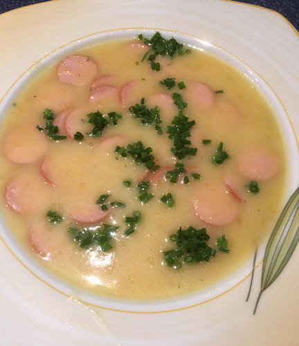 Kartoffelsuppe mit Möhren und Würstchen