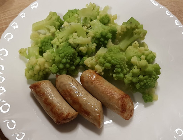 Bratwurst, geschnitten und in der Heißluftfriteuse gebacken. Dazu