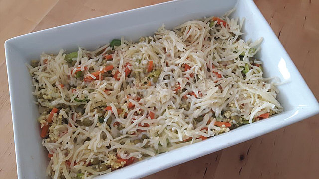 In die Auflaufform geben und mit Gratinkäse bestreuen.