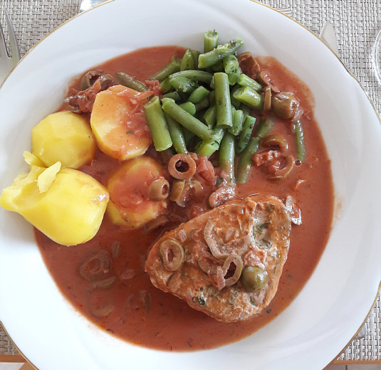 Thunfischsteak in Oliven-Tomaten-Soße und als Beilage grüne Bohnen und