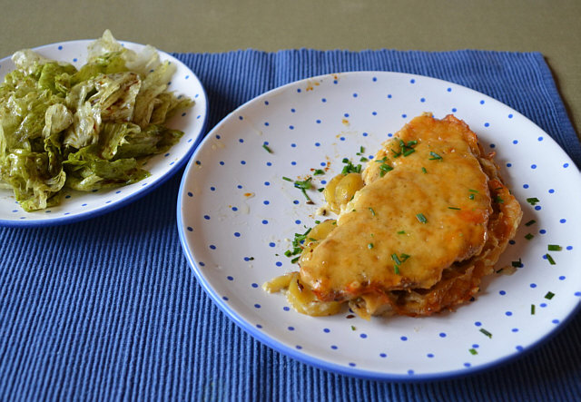 mit etwas Bouillon aufgießen und in einer Auflaufform im Backrohr garen.