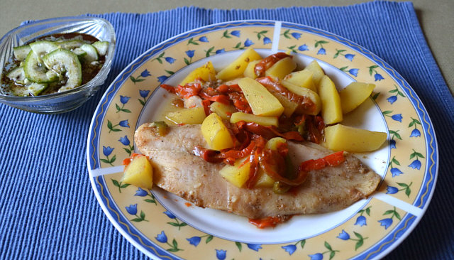 Zuckererbsen) und Salzkartoffeln.