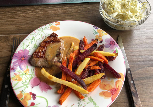Hüftsteak, Pfeffersoße, Gemüsepommes und Spitzkohlsalat