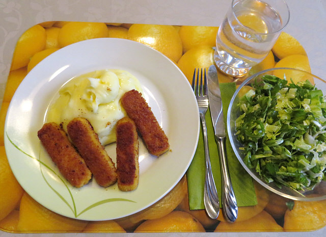 Lachsfischstäbchen, Kartoffelpüree und Endivien-Rucola-Salat.