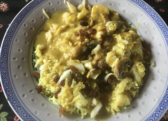 Curryhuhn mit Reis.