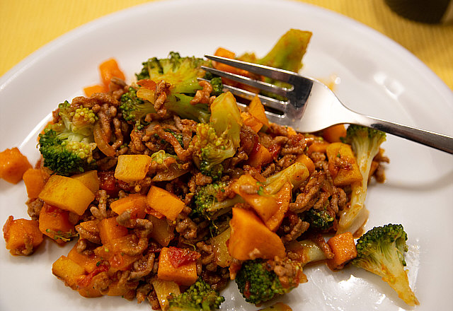 und das Ganze ein paar Minuten (Süßkartoffeln "al dente") in der Pfanne