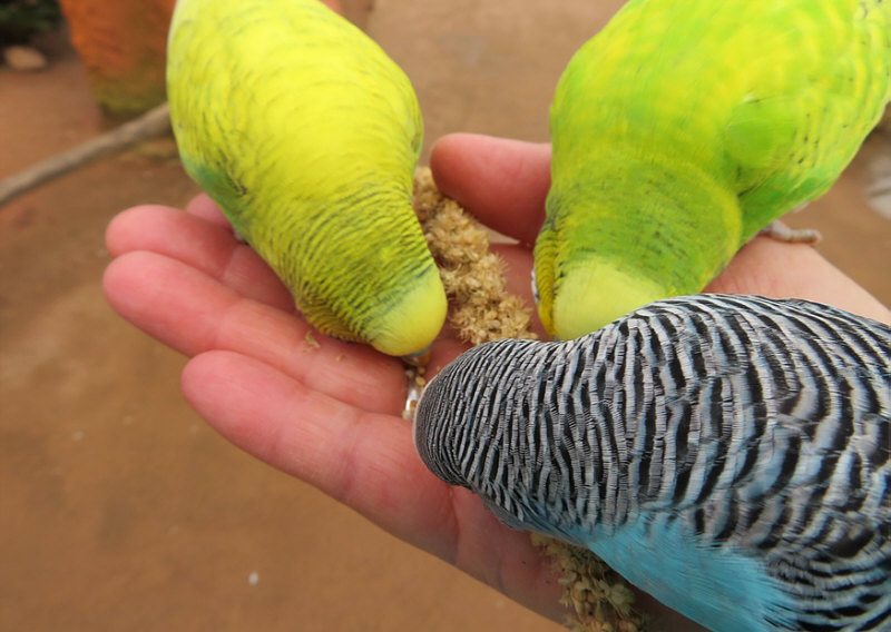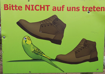 Wenn ich Sabine P. frage "bist du Hunde- oder Katzenfreund ?", dann bekomme ich die Antwort "ich bin Vogelfreund". Sabine hat ja selbst zwei Wellis daheim. Und als Vogelfreundin hat sie die begehbare Voliere des Vogelparks in Marlow sehr gerne besucht. Wir sind also in Meck-Pomm :). Als erstes begegnet uns dieses Schild: ![]() Wie ... treten ? Vögel fliegen doch ... Menschen fliegen nicht ... wie können diese denn auf die Vögel treten ? Und so treten wir ein ... und bleiben stehen: ![]() Die Wellensittiche kommen in Mengen angeflogen, direkt auf die Schuhe zu. Sie sind ganz verrückt auf Schuhe und alles, was sich daran befindet. ![]() Und da es zwischendurch auch mal regnet, ist der sandige Boden feucht und dementsprechend sahen dann auch unsere Schuhe bzw. Stiefel aus ;)). An einem Automaten können wir Körner zum Füttern kaufen. Sabine brachte Kolbenhirse mit, weil ihre Vögel die besonders mögen. Nicht nur ihre ... kaum hatte sie die Hirse in der Hand, gings im Vogelpark auch schon los: ![]() ![]() Selbstverständlich fotografierte Sabine so einige Bilder dort: ![]() ![]() ![]() ![]() Wellensittiche sind ja Schwarmvögel und deshalb sollen sie auch nicht alleine gehalten werden. Es gibt dort auch noch andere Vögel ... ![]() ... wie diese Zebrafinken. Die sind wegen ihrer Gesangskünste besonders beliebte Haustiere. Relativ pflegeleichte Tiere, die man auch in einer größeren Gruppe halten sollte. In dem Vogelpark gibt es auch noch Kamele, Flamingos, Kängurus, Aber wir kommen ja erstmal nicht von den Wellis los, die uns so liebevoll umlagern :)). |