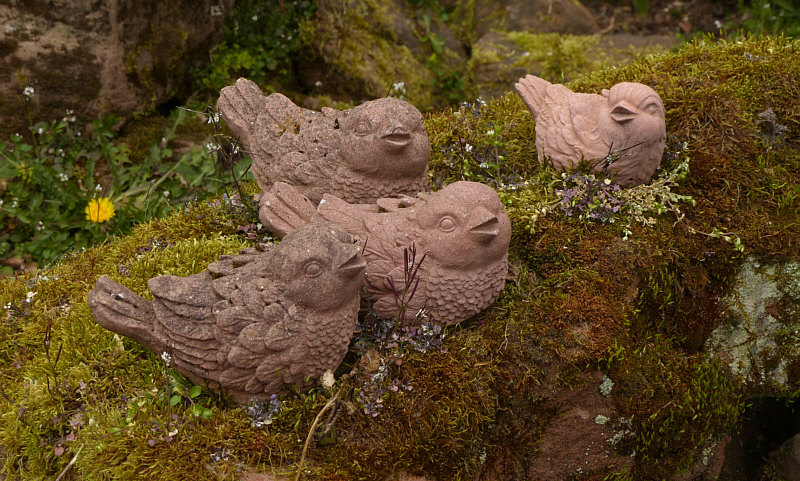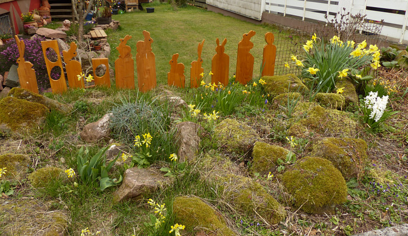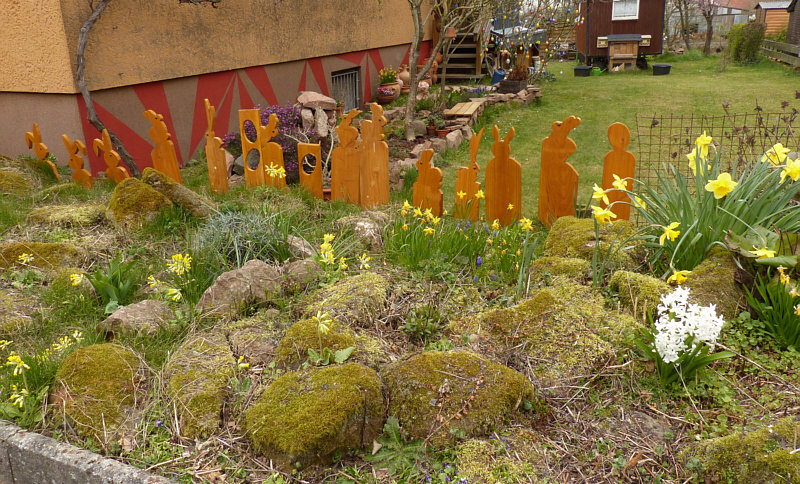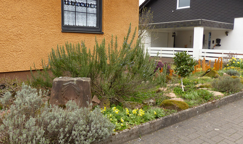Sie waren ja schon oft Thema, die neuen Vorgärten, in denen nur noch Steine zu finden sind. Und von denen es immer mehr werden. Umso wohltuender ist dieser Vorgarten, den ich bei unserem letzten Spaziergang gesehen habe. Er hat mir so gut gefallen, dass ich an der Haustüre geklingelt habe und dem Besitzer des Hauses mit Lob über seinen Vorgarten überschüttet habe. ![]() ![]() Ja, okay, auch hier Steine ... aber auch viele Blumen und viele schöne Details. ![]() ![]() So schön, diese Schlüsselblumen: ![]() ![]() Weiter links ein alter zur Zeit blühender Rosmarinstrauch: ![]() ![]() Es sind so kleine Details, die das Herz erwärmen ... wie der Hase vor der Haustüre, der sogar Möhren zu essen bekommt: ![]() Eine Bank mit gemeißelter Echse untendrunter: ![]() Vögel auf einem großen Stein: ![]() Vielleicht ist der Garten nicht so spektakulär wie angelegte Blumenbeete in einem Park ... ![]() ![]() ... aber hier darfs wachsen ... hier darfs natürlich sein. Eine alte Korkenzieherhasel neben der Tür ... ![]() ... eine Lenzrose, die auch im Verblühen eine Schönheit ist ... ![]() ... und keine Angst vor "Wildkräutern": ![]() Steine mit Moos ... ![]() ... und ein bißchen Jakobsweg: ![]() Und die Idee ... ![]() ... die eisernen Armlehnen einer Bank seitlich an der Treppe anzubringen. Ich spüre da ganz viel Liebe in diesem Vorgarten :)). |