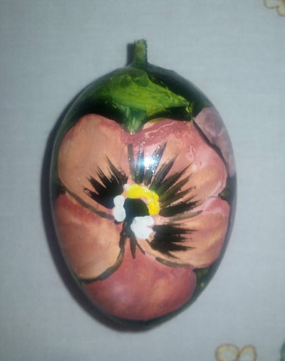 Das ist ein mit Papier beklebtes Gänse-Ei, das Brigitte auf einem Flohmarkt gekauft hat.