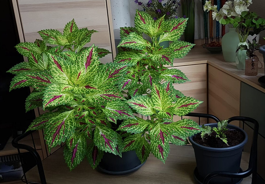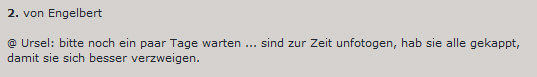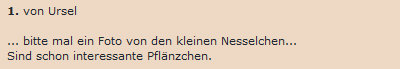 Ich hätte jetzt gedacht, dass das vor 2-3 Wochen war, ab die Zeit vergeht schneller als man denkt. Denn es ist knapp 5 Wochen her, als die Ursel diesen Kommentar ins Tagebuch schrieb: ![]() Ich hatte damals das geantwortet: ![]() Nun haben wir "ein paar Tage gewartet" und ich kann die Nesselchen zeigen. Alles Ableger, die mir irgendwie zugeflogen sind ;)) ... und die ich wurzeln ließ. ![]() Ich zeige mal 5 davon (zwei sind fast gleich): ![]() Hier kann man eines schön sehen ... wie viel Einfluß Tageslicht auf Buntnesseln hat. Die Ursprungspflanze stand im Freien, von der städtischen Gärtnerei in Landstuhl in einen der öffentlichen Pflanzentürme gesetzt. Dort hatte sie den ganzen Tag von morgens bis abends Tageslicht. Je heller es ist, desto höher der dunkle Anteil der Nesselchen. Wenn es weniger Licht ist, in der Wohnung z.B., dann erhöht sich der Grünanteil und so sind die neuen Blätter nicht dunkelrot, sondern heller rot mit grün. Das sieht man hier besonders schön ... ![]() ... draußen rot mit schmalem grünen Rand ... drinnen breiter grüner Rand mit rot in der Mitte. Auch hier sind die neuen Blätter heller ... ![]() ... während das bei rein grünen Buntnesseln nicht so stark auffällt: ![]() Besonders schön finde ich diese Variante ... ![]() ... die sogar dreifarbig ist ... grün, dunkelrot, cremefarben. Und dazu ganz unregelmäßig gemustert ... wie die impressionistische Version einer Buntnessel. Das sind noch recht kleine Pflanzen ... hier ist meine große Buntnessel, die ich wirklich nicht mehr "Nesselchen" nennen kann ;)). ![]() Von ihr habe ich auch eine Detailaufnahme für Euch: ![]() Das ist schon die zweite Generation dieser Pflanze ... ich werde wieder Ableger machen. Die nächste Generation steht übrigens auch schon bereit ... ![]() ... von 12 gesäten Samen sind 8 aufgegangen. Hier ist das ganz spannend, welche Farbe bzw. Musterung diese Nesselchen haben werden. Es gibt ja da sehr viele Variationen. Ich liebe Buntnesseln ... weil sie schön schnell wachsen, weil man sie leicht vermehren kann, weil mein nicht allzu grüner Daumen dafür ausreicht und weil sie so schön abwechslungsreiche Farben und Muster haben. |