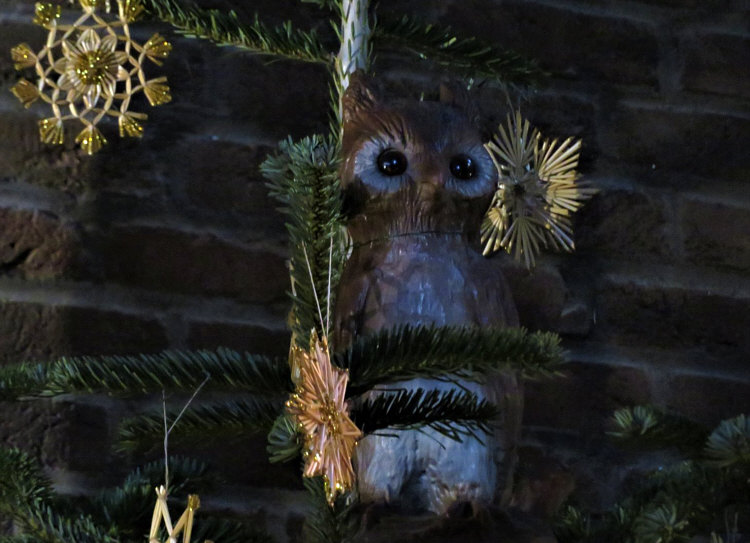 auch eine Eule in der Weihnachtsbaumkrone schaut dem Geschehen zu.