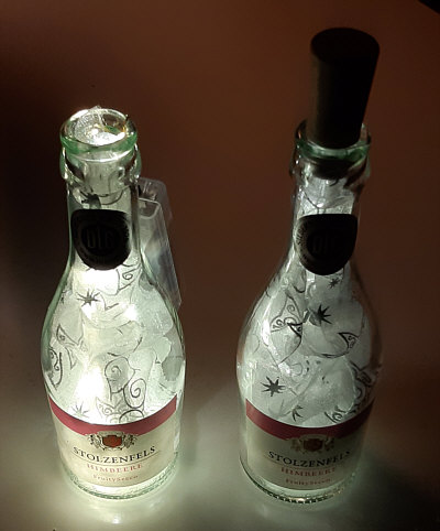 Chispeante - Weihnachtlicher Stoff und Minilichterkette in kleinen Sektflaschen.