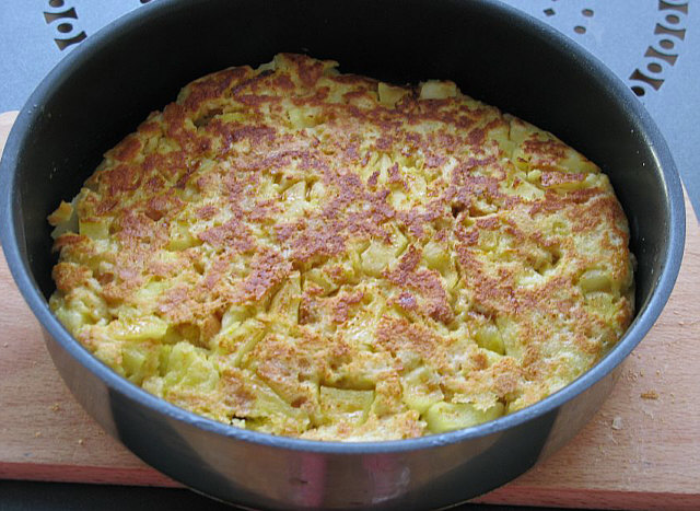 Dann den Apfel winzig schnippeln dazu, unterrühren und in Pfanne,