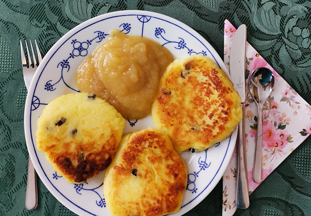 Quarkkeulchen mit Apfelmus, ein typisch Sächsisches Gericht.