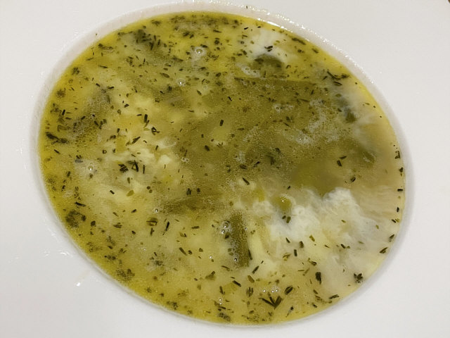 Suppe mit Basmatireis, Lachs und Edamame (grüne Sojabohnenkerne).