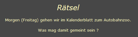 Gestern in der Rätselrubrik im Lichtblick: ![]() Das waren Eure Antworten: - Vielleicht eine Ausstellung von Dingen, die an der Autobahn gefunden wurden? - Autobahnzoo - Zoo an einer Autobahn-Raststätte. - noch nie gehört, demnach null Ahnung - Lach... keine Ahnung. - Das könnte ein Zoofachmarkt an einer Autobahnausfahrt sein. Tierbedarf, Aquaristikabteilung etc. - Ein Zoo der wie eine Grünbrücke über eine Autobahn führt ? - Ein Zoo, nah an der Autobahn, vielleicht über eine Autobahnabfahrt sofort zu erreichen? - Vielleicht sowas wie ein Autofriedhof? - ein zoo, den man über eine autobahn erreicht? - Wie es zu dem Wort kommt weiß ich nicht, aber was es ist habe ich mal gelesen. - Spontan fällt mir dazu ein, vielleicht etwas über den Lebensraum Autobahnstreifen. Oder gibt es einen Streichelzoo an einem Rastplatz? - Ich war schon dort und rate deshalb nicht mit :-) - Naheliegend würde sein "ein Zoo nahe an der Autobahn"... das wird es jedoch nicht sein. Nun ... Ihr werdet überrascht sein ... ... klick --> zum Autobahnzoo <-- klick |