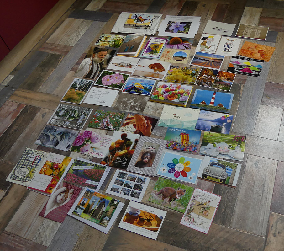 Heute seht ihr die umgedrehten Karten ... ... habe ich gestern gesagt ... und hier sind sie auch schon: ![]() Ich zeige jetzt keine Karte in groß ... das geht wegen des Urheberrechts nicht. Ich könnte die Sticker zeigen ... aber ich mag Karten mit und ohne Sticker ... ich will niemanden herausheben. Aber ich kann ein paar Briefmarken zeigen ... eine war sogar mit dem Bild der Absenderin dabei. Und es gibt auch Briefmarken mit Glückwünschen drauf: ![]() ![]() Es waren Briefmarken mit 60, 70 und 80 Cent dabei ... was man grad zur Hand hat. Diese Briefmarke ... ![]() ... erreichte mich ungestempelt. Zwei hab ich noch: ![]() ![]() Wisst Ihr ... das war gestern wie Weihnachten für mich ... da passt das doch wunderbar :)). Ganz große Überraschung ... hab mich seeehr gefreut darüber. War das nun Zufall oder gab es da eine kleine Aktion ? Ich war wirklich völlig ahnungslos ... Ihr seid klasse. Nicht nur die, die mir Karten und mehr geschickt haben, einfach alle. Jeder Kommentar, jeder Glückwunsch, jedes "da sein" ist ein Geschenk für mich :)). |