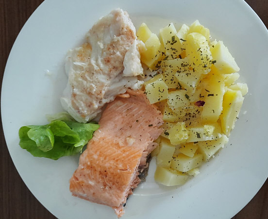 Der Fisch wurde meliert gebraten. Dazu gab es noch Grünen Salat und eine