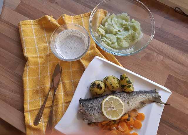 Frische Gebirgsforelle in der Folie gegart, dazu Petersilienkartoffeln,