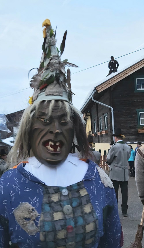 Was hältst du davon: Etwas, das 25-50 Kilo wiegt, auf dem Kopf tragen und damit in 10 Stunden 13 Kilometer laufen. Wie ... höre ich da ein "bist wohl wahnsinnig" ? Oder "hast schlecht geschlafen" ... oder "träumst gerade" ? Nein, ich bin ganz wach ... denn ich sehe gerade dieses Bild: ![]() Das ist alles Realität ... gestern im Gasteinertal. Fotografiert von Christine B. Dort gibt es seit dem 14. Jahrhundert eine Tradition, die sich "Perchtenlauf" nennt. Alle vier Jahre startet dieser Lauf. Perchten sind weibliche Masken- und Sagengestalten, die in den Wintermonaten auftreten. Über 140 Personen machen beim Lauf mit, 30 Kappenträger sind dabei. Die Figuren versinnbildlichen alle möglichen Geister und Dämonen, an die die Menschen immer glaubten. Ein Percht ist eine Gestalt des alpenländischen Brauchtums ... es gibt zwei Gruppen: die "Schönperchten" und die "Schiachperchten". Das ist die "Frau Perchta", hier gibt es Schön und schiach in einer Person. ![]() Vorne ist sie schön ![]() Hinten ist sie schiach Frau Perchta zeigt das Gute und Böse im Menschen in einer Figur. Ein schönes, freundliches Frauengesicht auf der Vorderseite, ein fratzenhaftes, furchterregendes Gesicht auf der Rückseite. Sie geht freundlich auf umstehende Personen zu, reicht die Hand und dreht sich dann ganz schnell um und zeigt ihr anderes Wesen. Die Schönperchten (die mit den Blumenspiegeln auf den Köpfen) begrüßen den Frühling, die Schiachperchten treiben den Winter aus. ![]() König Herodes läuft auch mit und hier sieht man rechts im Bild eine Schiachperch. Auch die Kramperl gehören dazu: ![]() Beim Perchtenlauf machen nur Männer, teilweise als Frauen verkleidet, mit. ![]() ![]() Früher hatten die Menschen Angst vor den langen dunklen Nächten und ihren Dämonen ... ... die Spiegel zwischen den Blumen sind dazu da, dass die Dämonen dort reinschauen und sehen, wie hässlich sie selbst sind und das Weite suchen. Alle Schönperchten tragen weiße Handschuhe und einen Säbel. Kommen sie vor ein Haus, tanzen sie und verbeugen sich dann. Mit den Schmuck auf dem Kopf. Damit nix passiert, steht ein als Frau verkleideter Mann daneben und hilft den Kopfschmuck wieder hochzuheben. Ich darf vorstellen ... den Zwiebelturm ... ![]() ... und die Heiligen Drei Könige und der Sternträger : ![]() ![]() Eine Schnabelpercht ist auch dabei ... ![]() ... und das ist die Habergeiss: ![]() Ein Bärentreiber mit zwei Bären ist auch dabei ... hier ist einer davon ... ![]() ... die Bären symbolisieren die Macht des Winters und der bösen Elemente, welche aber vom Bärentreiber unter Kontrolle gehalten werden. Im Perchtenzug gehen der Treiber und seine zwei Bären nach den Kappenträgern, um nachdrängenden Zuschauern den Weg zu versperren. Die Bären heißen Teddy und Ursus. So ... und nun können wir live dabei sein beim 2018er Lauf: Hier gibts weitere Infos zu den einzelnen Figuren. |
