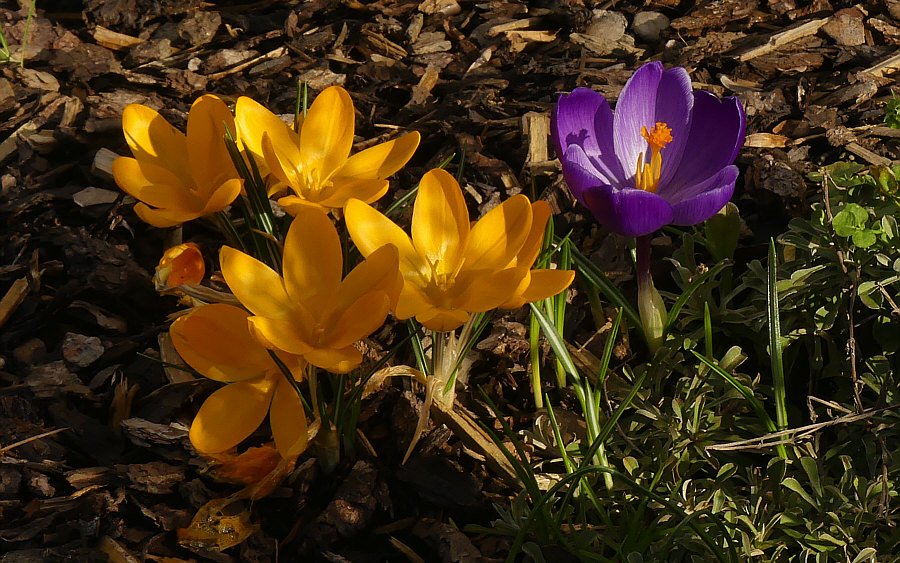 Die Farben gelb und lila leuchten in der Frühlingssonne ...
